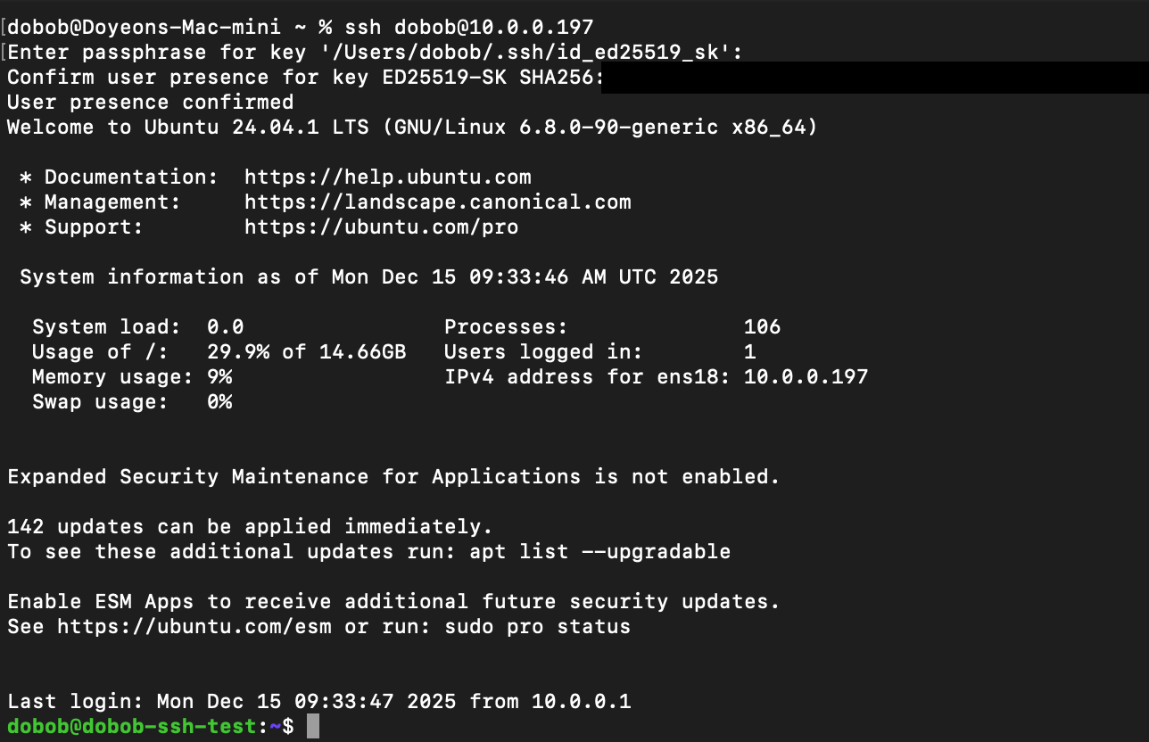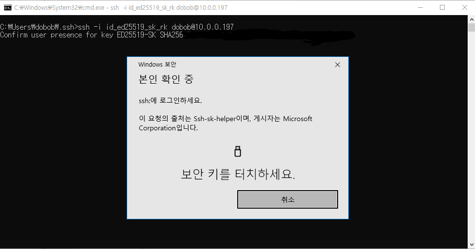 ssh {username}@{ipaddr} -i id_ed25519_sk_rk해당 명령어로 접속을 하게 된다면, yubikey를 터치 하라는 창이 나오게 된다